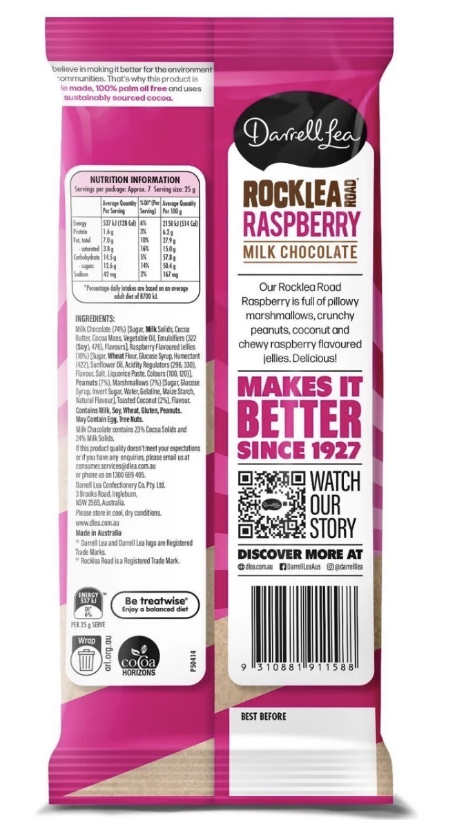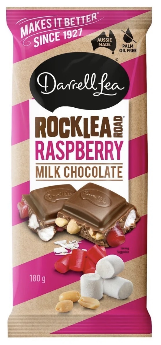 Darrell Lea’s Raspberry Rocklea Road Block is bursting at the seams with raspberry liquorice, marshmallows, crunchy peanuts and coconut – a traditional combination that can’t be beat.
