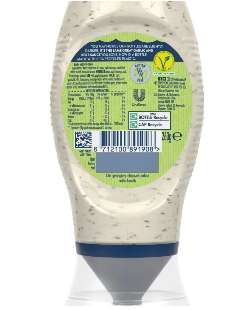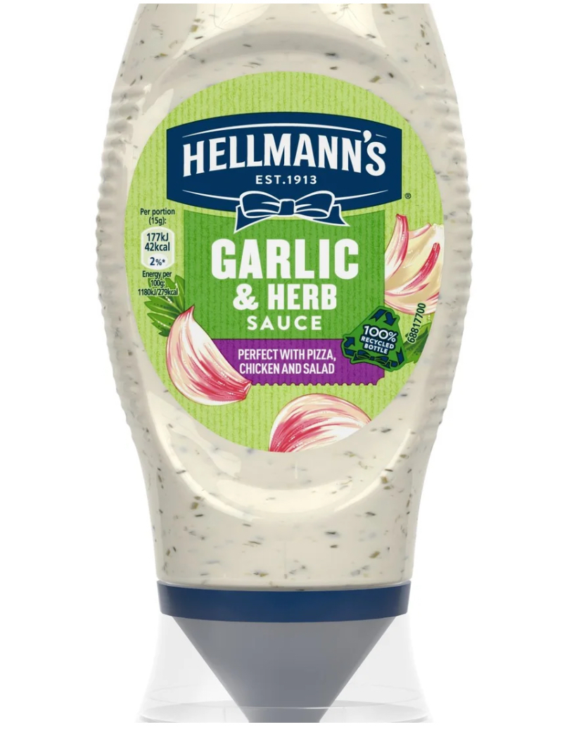 With its creamy texture and herby taste, Hellmann's garlic sauce is made with natural & simple ingredients including free-range eggs and it's suitable for vegetarians and is gluten free. This condiment is great for adding extra flavour to your BBQ chicken wings, drizzling over your salad, as a burger sauce or adding to pizza for a creamy herby dip. Use Hellmann's Garlic & Herb Creamy Sauce to make a delicious burger spread or mix into potato salad to add a herby finish - be creative and use what you have on hand - food is too good to be wasted, Do you like our Garlic & Herb Creamy Sauce?