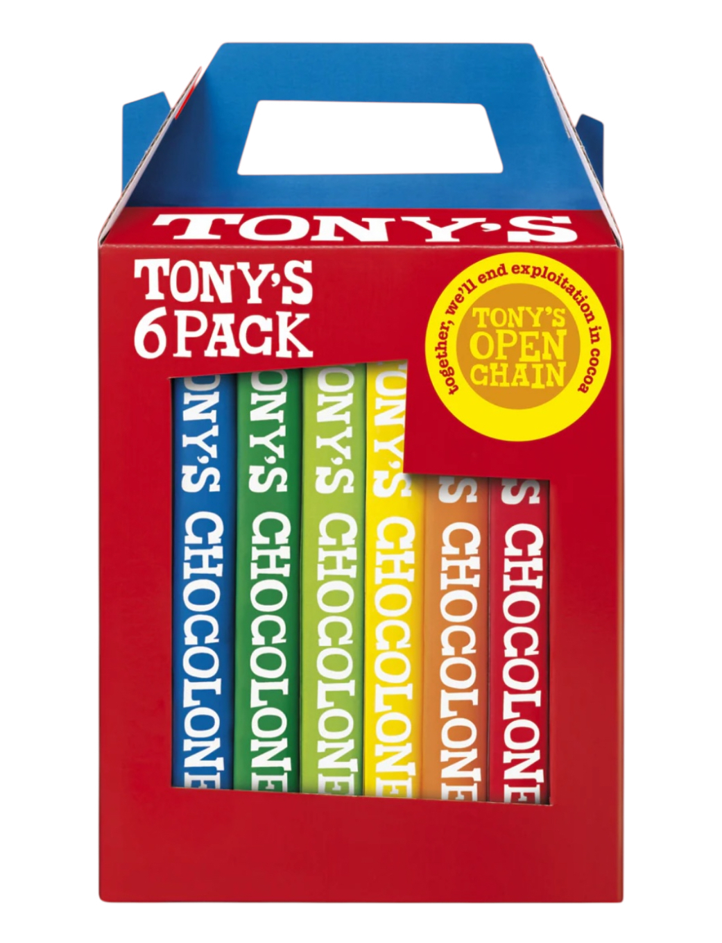 A rainbow of Tony’s bars to treat someone to; your best friend, mother in law or that cute new neighbour. This box is choc full of classic Tony's flavours: milk chocolate, milk caramel sea salt, milk almond honey nougat, dark almond sea salt, milk hazelnut and extra dark. It's packed with smiles! PS. Makes a nice handbag once the choc is gone.