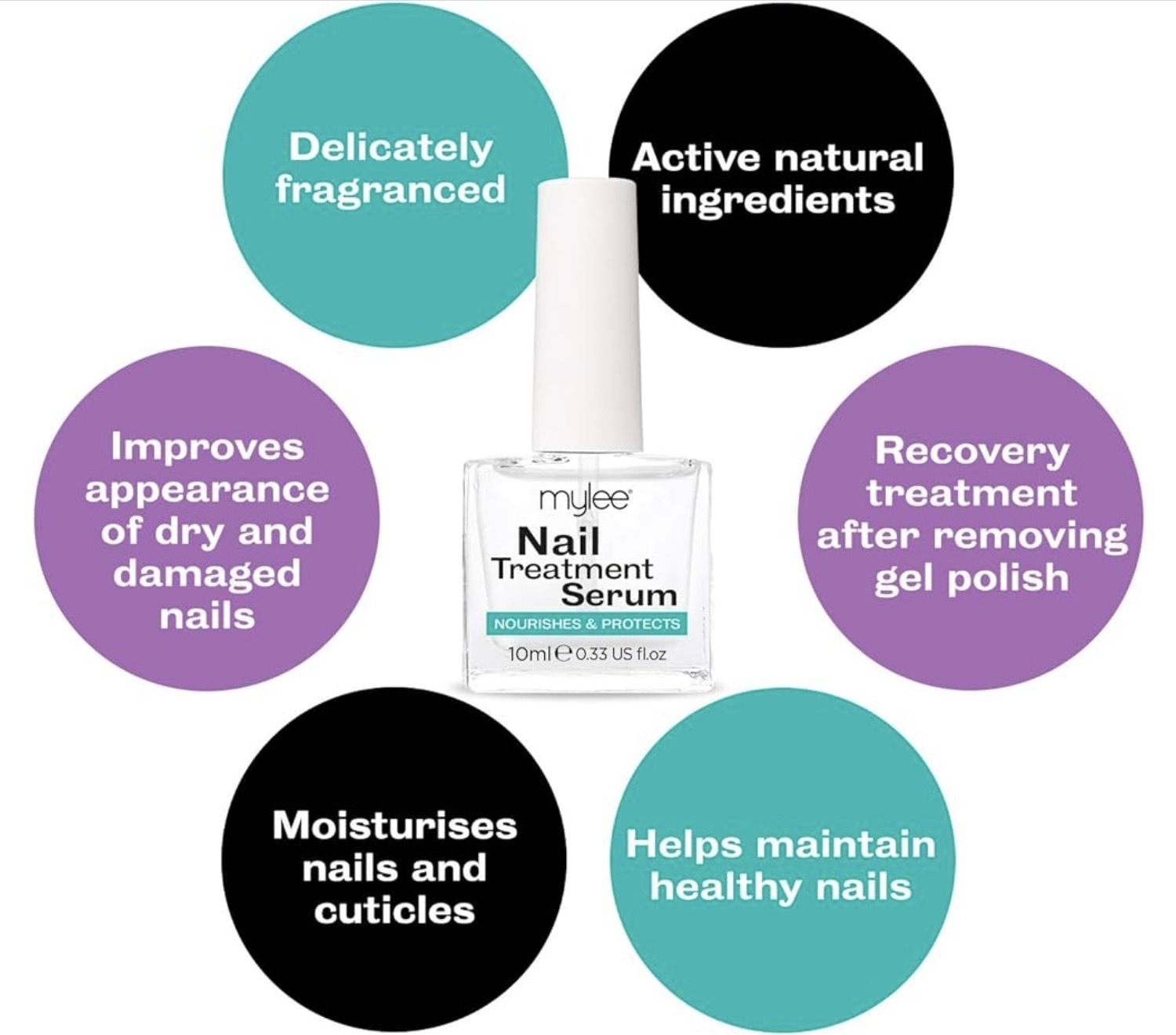 The MYLEE 10ml Nail Treatment Serum is a natural, deeply moisturising formula designed to strengthen and repair dry, damaged, or brittle nails and cuticles. It is a cruelty-free product ideal for use after gel polish removal and for daily maintenance.