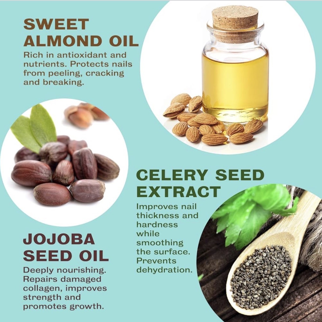 Celery Seed Extract: Works to improve nail strength, smooth the nail surface, and combat dehydration and brittleness.