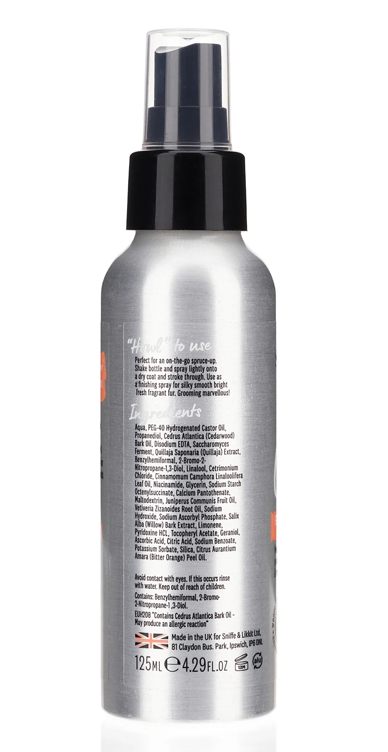 Perfect for an on-the-go spruce-up. Shake bottle and spray lightly onto a dry coat and brush through. Use as a finishing spray for silky smooth bright fresh fragrant fur. Grooming marvellous!