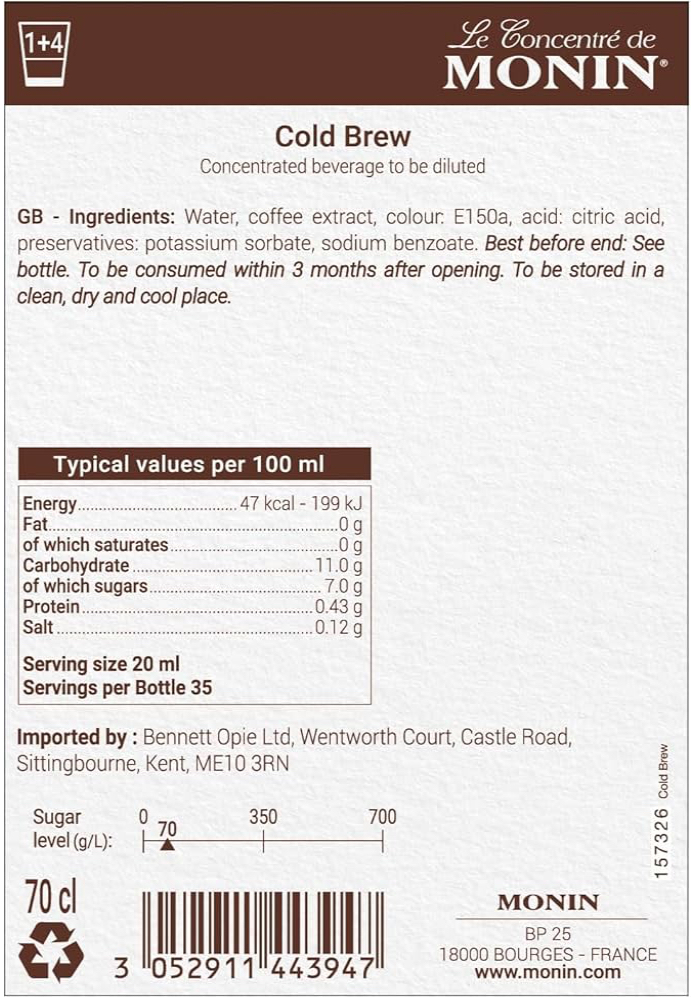 Le Concentre de MONIN Cold Brew is made by infusing ground coffee in cold water for about 12h. This natural procedure means all of the coffee’s organoleptic and aromatic properties are extracted.