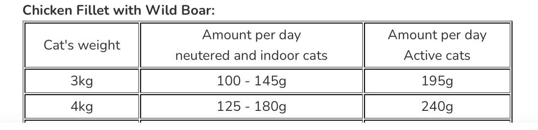 45% chicken fillet, 28.8% broth, 12% chicken gizzards, liver & fat, 10% wild boar, 2% beetroot, 1% blueberry, 1% minerals, 0.2% salmon oil