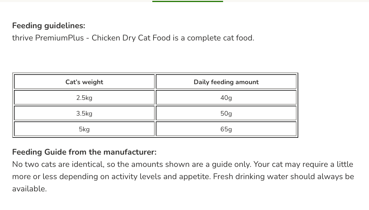 Cats are true carnivores, so they need to eat foods that provide them with the appropriate meat-based nutrients. Standard cat foods are mainly high in carbohydrate with a lower protein content. Thrive PremiumPlus uses modern production technologies and processes to make sure that the protein content of thrive PremiumPlus is noticeably higher than other grain free cat foods (90%). It is also a single protein food product, that only contains protein from chicken.