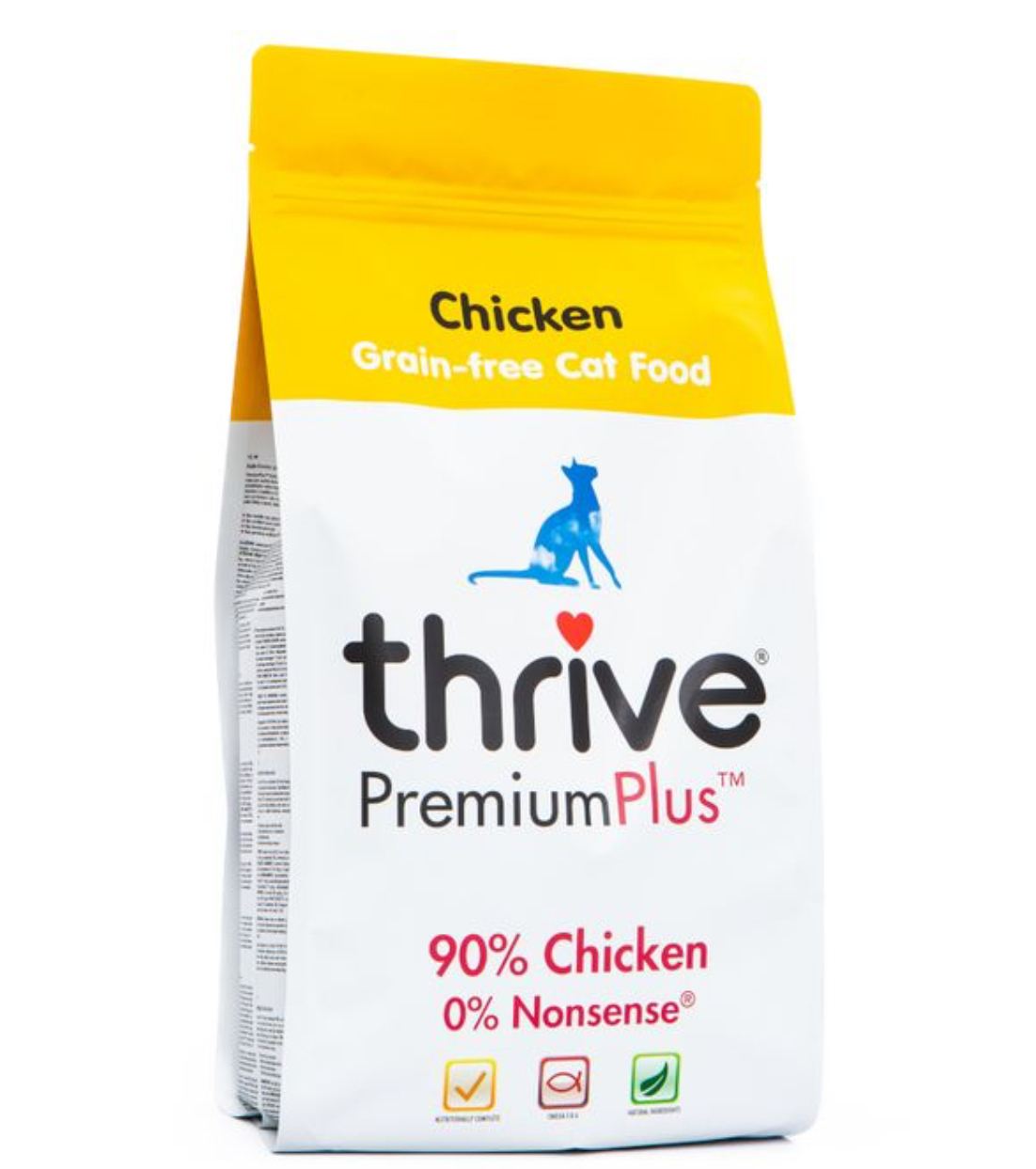 Thrive PremiumPlus Chicken Dry Cat Food is a complete food for cats of all breeds and lifestages. It contains 90% meat, which is an exceptionally high meat content for this type of cat nutrition. The recipe contains everything that you would expect from a premium cat food, without any unnecessary extras, offering your cat an easy to digest and balanced nutrition with premium chicken, sweet potato and potato, as well as essential Omega-3 and Omega-6 fatty acids.