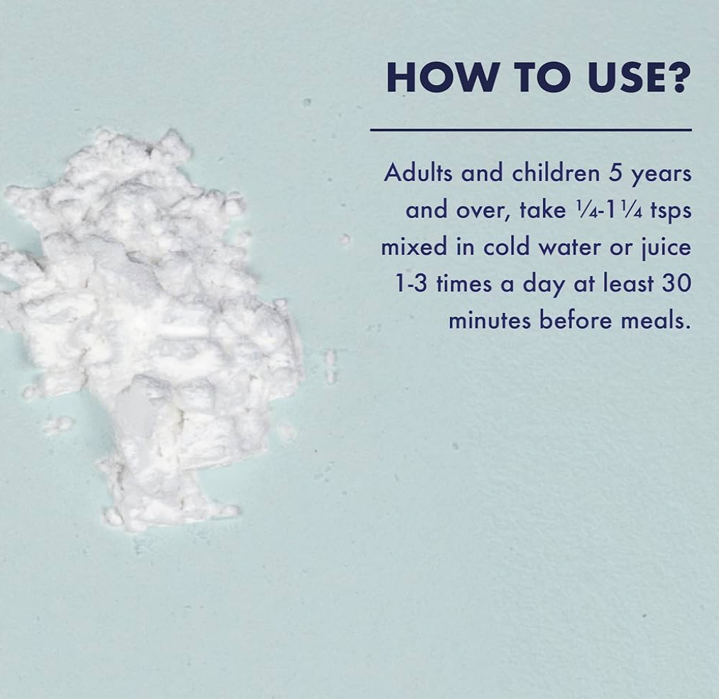 Adults and children 5 years and over, take ¼-1¼ tsps mixed in cold water or juice 1-3 times a day at least 30 minutes before meals. Do not exceed recommended daily intake. Food supplements should not be used as a substitute for a varied and balanced diet and healthy lifestyle.