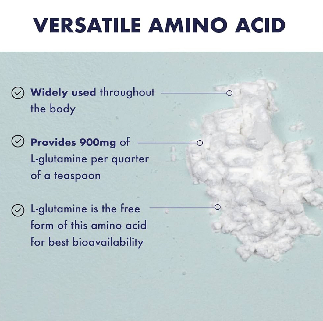 Powder format of this versatile amino acid which is used widely throughout the body. Contains zero excipients. We use 100% high quality, free form L-glutamine for the best bioavailability. Ideal for flexible dosing, each 1/4 teaspoon provides 900mg L-glutamine.