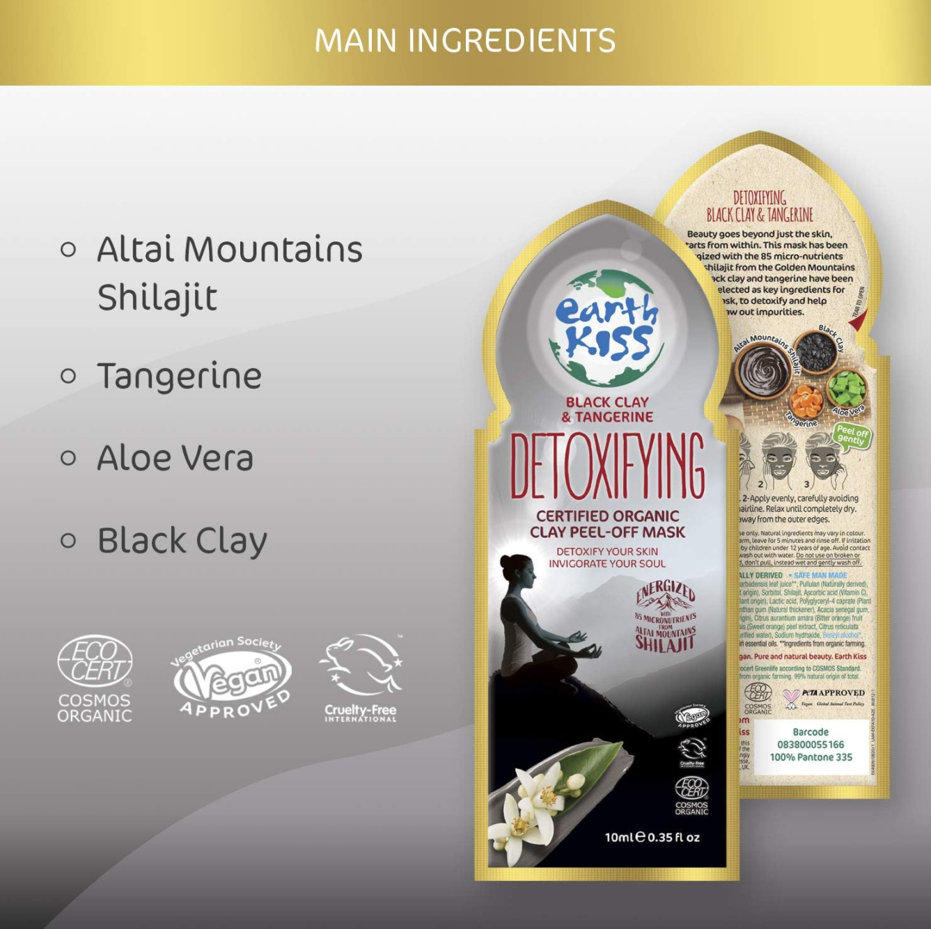 Aloe barbadensis leaf juice, Pullulan (Naturally derived), Kaolin (Natural clay), Glycerin (Plant origin), Sorbitol, Shilajit, Ascorbic acid (Vitamin C), Tocopherol (Vitamin E), Citric acid (Plant origin), Lactic acid, Polyglyceryl-4 caprate (Plant origin), Algin (Natural thickener), Xanthan gum (Natural thickener), Acacia senegal gum, Limonene*, Trehalose (Natural origin), Citrus aurantium amara (Bitter orange) fruit extract, Citrus aurantium sinensis (Sweet orange) peel extract, Citrus reticulata (Tangerine) fruit extract, Aqua (Purified water), Sodium hydroxide, Benzyl alcohol, Parfum (Natural).