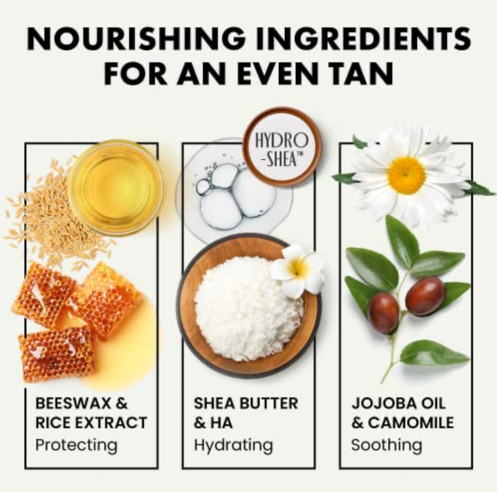 Regular use of tanning lotion causes skin to dry out. We combat this by INTENSELY HYDRATING SKIN. Hyaluronic acid locks in moisture while shea butter BOOSTS COLLAGEN. Weโve also added inflammation-reducing camomile extract to soothe sensitive skin.