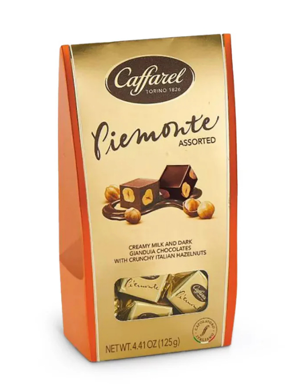 Caffarel Piemonte assorted ballotin contains an assortment of milk and dark chocolate Italian gianduja treats studded with roasted hazelnuts.