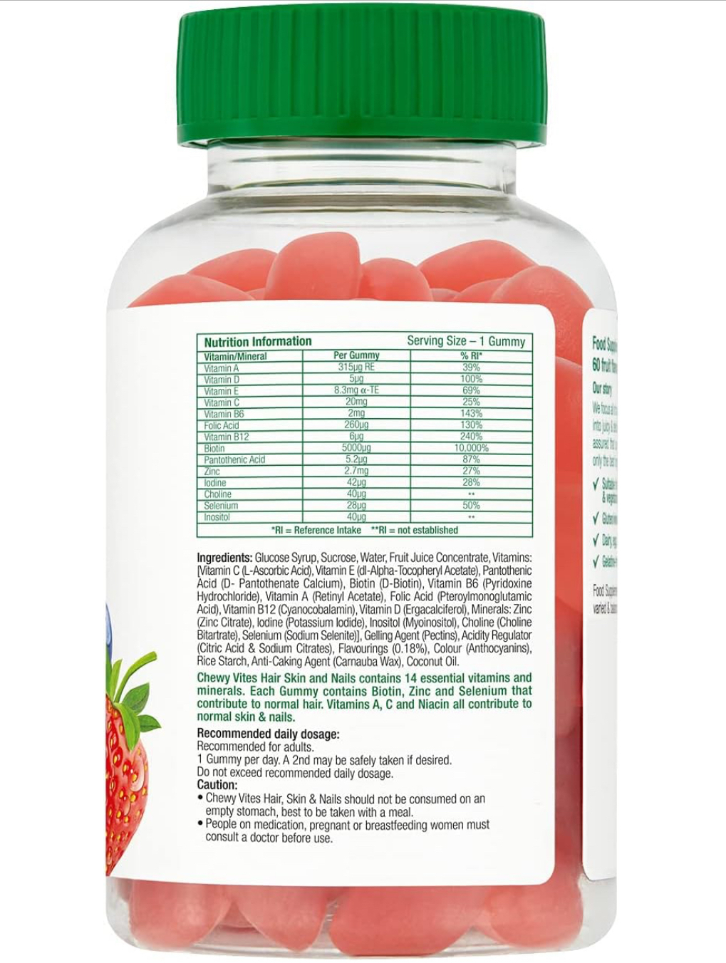 Glucose Syrup, Sucrose, Water, Fruit Juice Concentrate, Vitamins: Vitamin C (L-Ascorbic Acid), Vitamin E (di-Alpha-Tocopheryl Acetate), Pantothenic Acid (D- Pantothenate Calcium), Biotin (D-Biotin), Vitamin B6 (Pyridoxine Hydrochloride), Vitamin A (Retinyl Acetate), Folic Acid (Pteroylmonoglutamic Acid), Vitamin B12 (Cyanocobalamin), Vitamin D (Ergacalciferol), Minerals: Zinc (Zinc Citrate), lodine (Potassium lodide), Inositol (Myoinositol), Choline (Choline Bitartrate), Selenium (Sodium Selenite)], Geling Agent (Pectins), Acidity Regulator (Citric Acid & Sodium Citrates), Flavourings (0.18%), Colour (Anthocyanins), Rice Starch, Anti-Caking Agent (Carnauba Wax), Coconut Oil.
