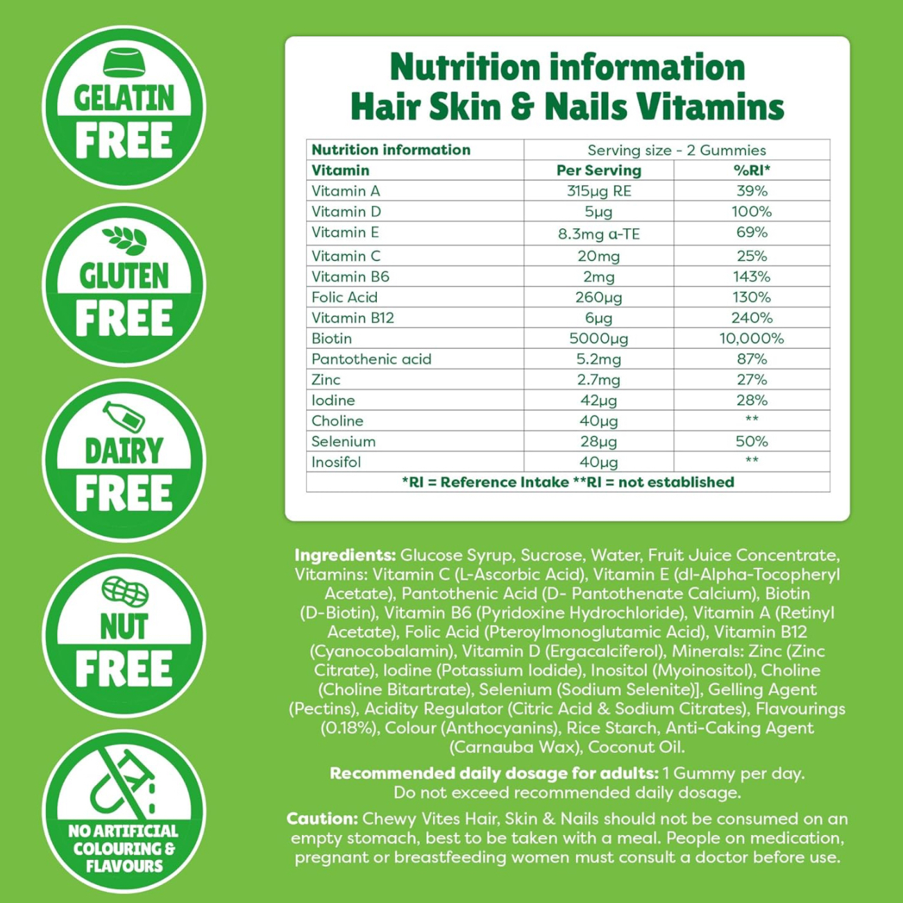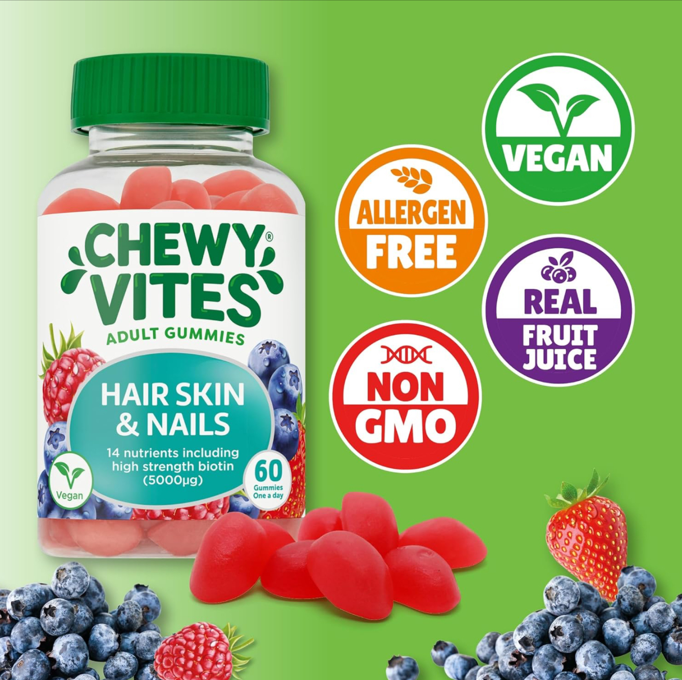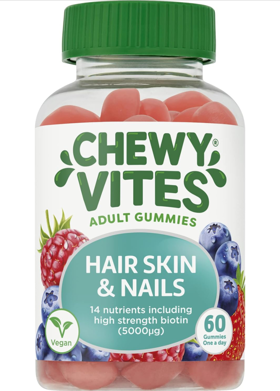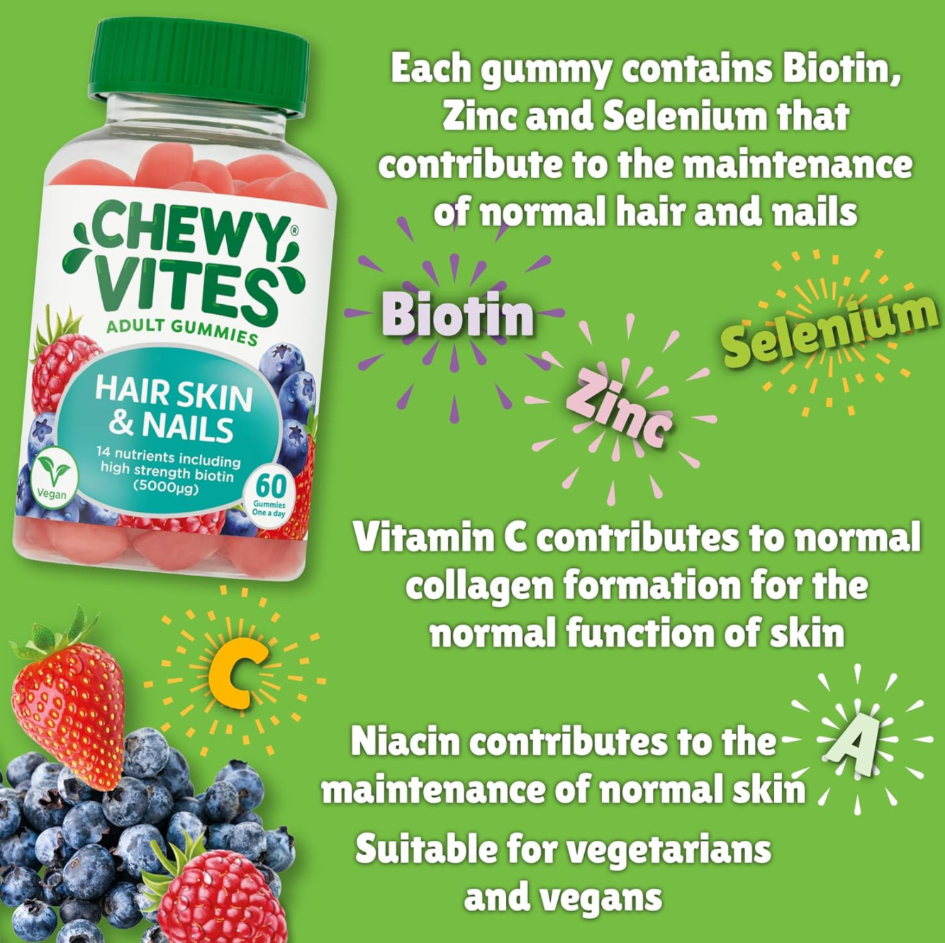 Chewy Vites adults hair skin and nails fruity chews contain a balanced multi vitamin including Biotin, zinc and selenium that contributes to normal hair. Vitamin A, C Niacin all contribute to normal skin and nails.