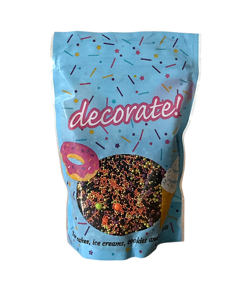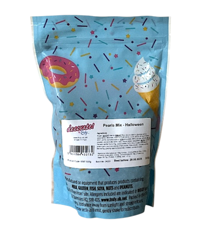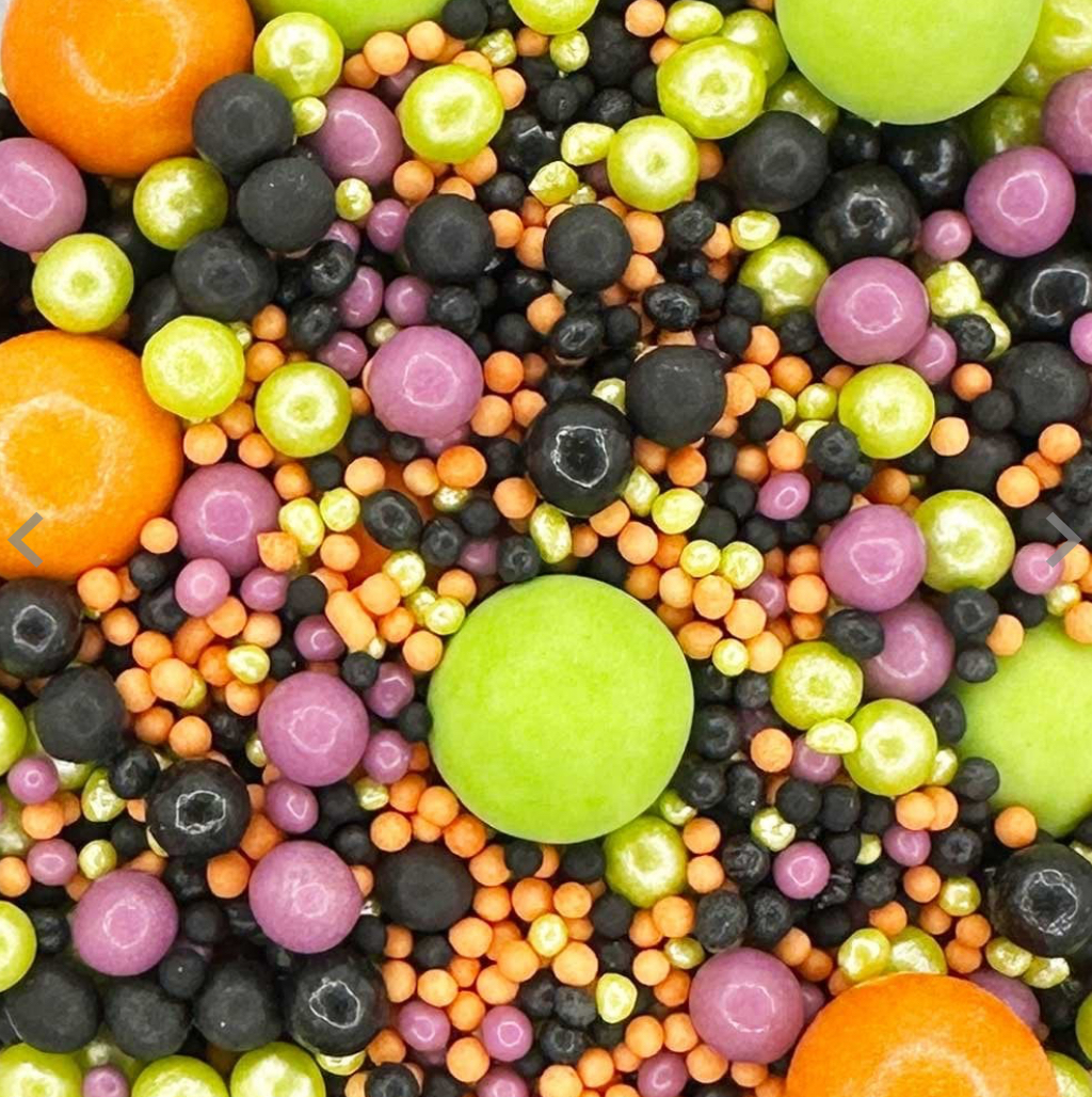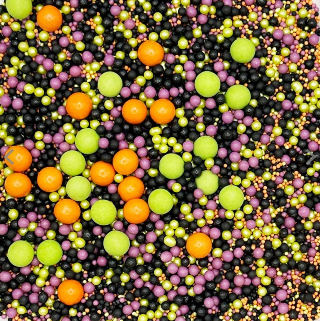 A beautiful mix of glimmer, polished and matt pearls, chocoballs and 100s and 1000s ranging in size from 2mm 100's and 1000's and pearls to 10mm delicious chocoballs. Ideal for themed cakes, Halloween and spooky celebrations. A unique and exciting blend.