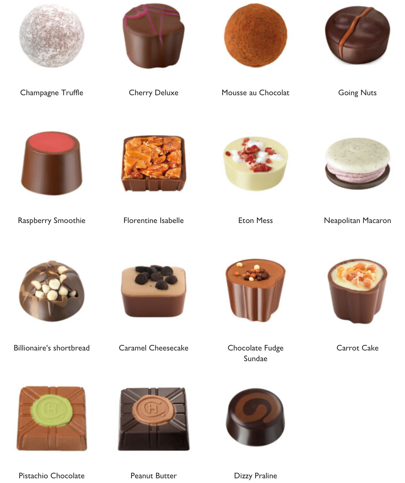 Cocoa solids (cocoa butter, cocoa mass), sugar, full cream MILK powder, sweetened hazelnut paste (HAZELNUTS, sugar, emulsifier (sunflower lecithin)), caramel half-salted butter (glucose fructose syrup, sweetened condensed MILK, half salted butter (from MILK), sugar, salt), HAZELNUT paste, butter oil (from MILK), stabilisers (sorbitol, glycerol), florentines (ALMOND NUTS, sugar, butter (from MILK), glucose syrup, honey, cream (from MILK), HAZELNUTS), skimmed MILK powder, roasted HAZELNUTS, whipping cream (cream (from MILK), stabiliser (carrageenan)), vegetable fats (coconut, shea, sunflower), pistachio nuts paste (PISTACHIO NUTS, rapeseed oil), glucose syrup, half candied cherries (cherries, liquor, kirsch), amaretto, peanut butter paste (PEANUTS, sea salt), fruit juice concentrates (raspberry, carrot), cocoa biscuits (WHEAT flour, cocoa powder, sugar, butter (from MILK), sunflower oil, salt, raising agent (ammonium bicarbonate), flavourings), emulsifiers (SOYA lecithin, sunflower lecithin), shortbread biscuits (WHEAT flour, coconut oil, sugar, cocoa butter, WHEAT starch, raising agents (sodium bicarbonate, ammonium bicarbonate), salt), neutral alcohol, freeze dried strawberry powder, meringue granules (sugar, cocoa butter, WHEAT starch, EGG white), walnut paste (WALNUTS, sunflower oil, citrus fibre, emulsifier (SOYA lecithin)), ALMOND NUTS paste, invert sugar syrup, cream (from MILK), dextrose, champagne (SULPHITES), cocoa powder, caramelised sugar, lactose (from MILK), yoghurt powder (yoghurt powder (from MILK), sugar, acidity regulators (malic acid, citric acid), flavouring), cereals coated with chocolate (crisped rice (rice flour, sugar, cocoa butter, salt), sugar, cocoa mass, cocoa butter, whole MILK powder, whey powder (from MILK), butter oil (from MILK), vegetable fat (coconut), glazing agent (gum arabic), glucose syrup, modified starch, emulsifier (SOYA lecithin), flavouring, spices), dried carrot pieces (carrot pieces, sugar), flavourings, natural colours (beetroot, carotene, paprika, annatto), concentrated whey (from MILK), freeze dried strawberry pieces, acidity regulator (citric acid), molasses, cinnamon paste (glucose syrup, cinnamon, plain caramel, essential oil (cinnamon)), ground cinnamon, vanilla seeds, MILK protein, ground nutmeg, concentrate of spirulina. Dark chocolate contains minimum 70% cocoa solids. Milk chocolate contains minimum 40% cocoa solids, minimum 14% milk solids. White chocolate contains minimum 36% cocoa butter, minimum 27% milk solids.Caramel milk chocolate contains minimum 36% cocoa solids, minimum 26% milk solids. For allergens, including cereals containing gluten, see ingredients in BOLD. All chocolates in this box may contain tree nuts, peanuts, milk, soya, gluten, wheat, egg, sesame.