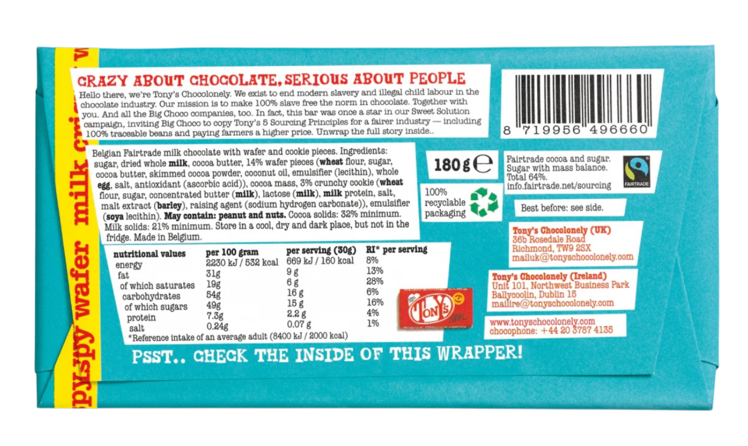 sugar, dried whole milk, cocoa butter, 13.89% wafer pieces (wheat flour, sugar, cocoa butter, skimmed cocoa powder, coconut oil, emulsifier (soya lecithin), whole egg, salt, antioxidant (ascorbic acid)), cocoa mass, 2.78% feuilletine biscuit (wheat flour, sugar, concentrated butter (milk), lactose (milk), milk protein, salt, malt extract (barley), raising agent (sodium hydrogen carbonate)), emulsifier (lecithins (soya))