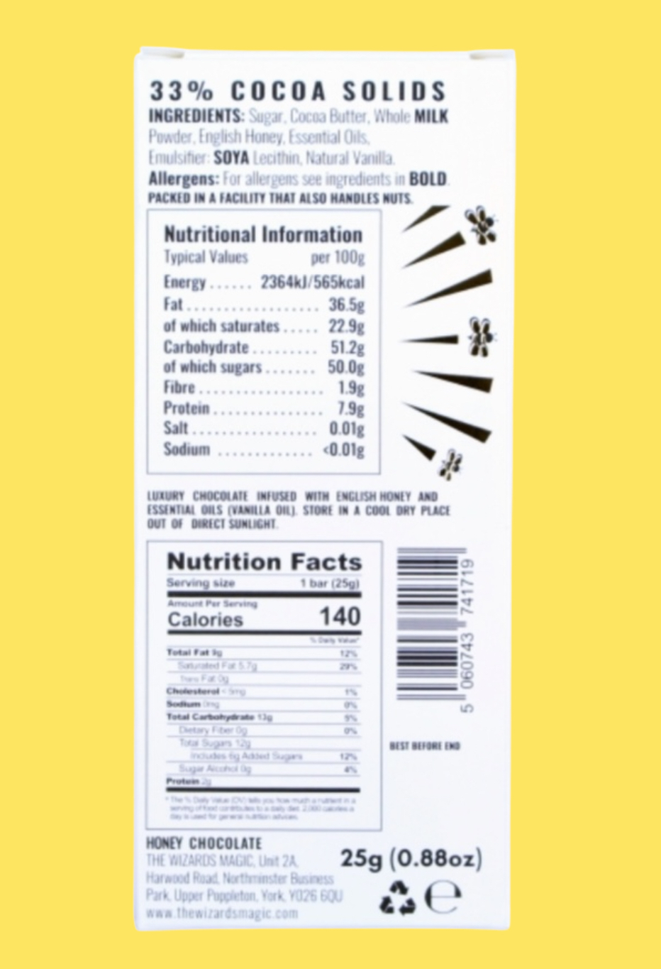 The Wizards Kids English Honey Chocolate is for those of you that want your children to indulge with rich, smooth chocolate infused with 100% Pure British Set Honey. Honey holds unique benefits such as antibacterial properties. In England, honey is sourced twice a year and is sealed in wax by the bees. They then infuse this honey into their chocolate to create this magical bar that tastes incredibly good for your little ones.