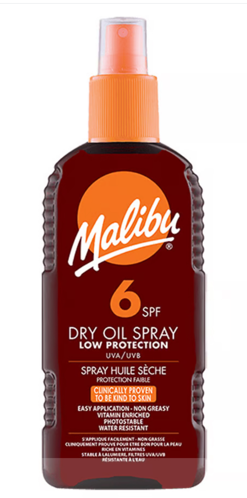 Malibu SPF6 Dry Oil Spray provides protection from UVA and UVB rays. Build a bronzed glowing tan with this oil. It protects your skin against harmful and damaging UV rays with a low SPF factor 6.